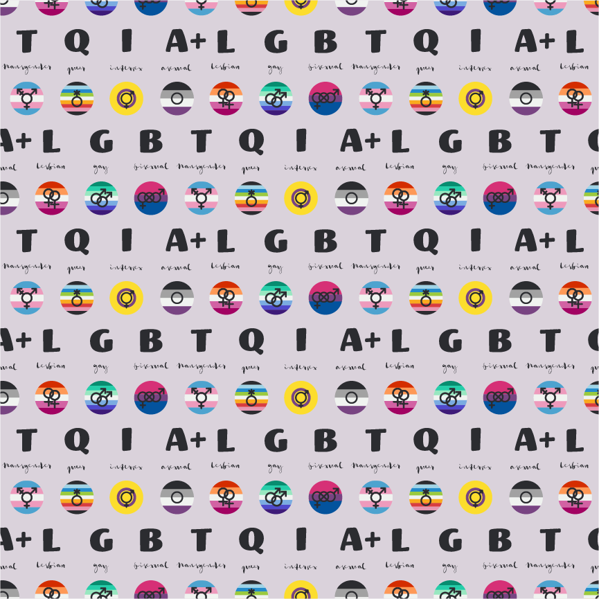 Love is Love LGBTQIA+ Pride-Stoffe, entworfen von Mathew Boudreaux von Mx Domestic (FKA Mister Domestic). LGBTQIA+-Akronym-Druck (mit passendem Symbol und Bedeutung) in Mehrfarben mit den Farben der repräsentativen Flaggen für jedes Symbol. Das Modell ist ein 12 x 12 Zoll großes Quadrat der Wiederholung.