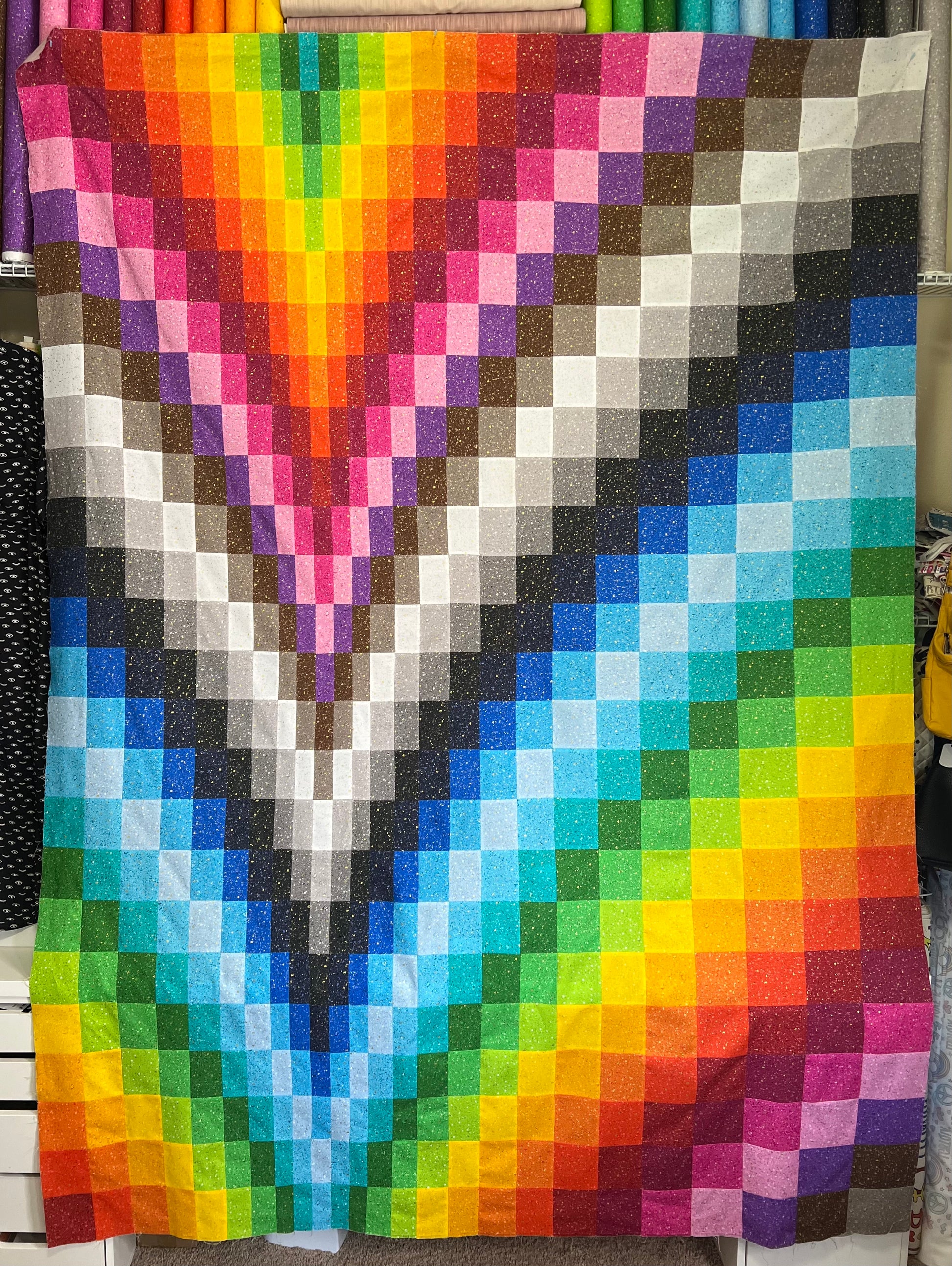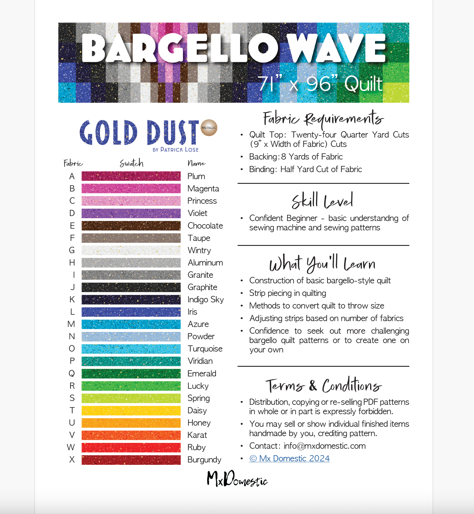 Diese Auflistung gilt für das Bargello Wave-PDF-Muster von Mx Domestic. Dieses anfängerfreundliche und für Fortgeschrittene geeignete PDF-Muster funktioniert mit 24 verschiedenen Stoffen aus Patrick Loses Gold Dust Fabric, könnte aber in jedem Farbverlauf aus jeder Kollektion gleichermaßen dynamisch sein.