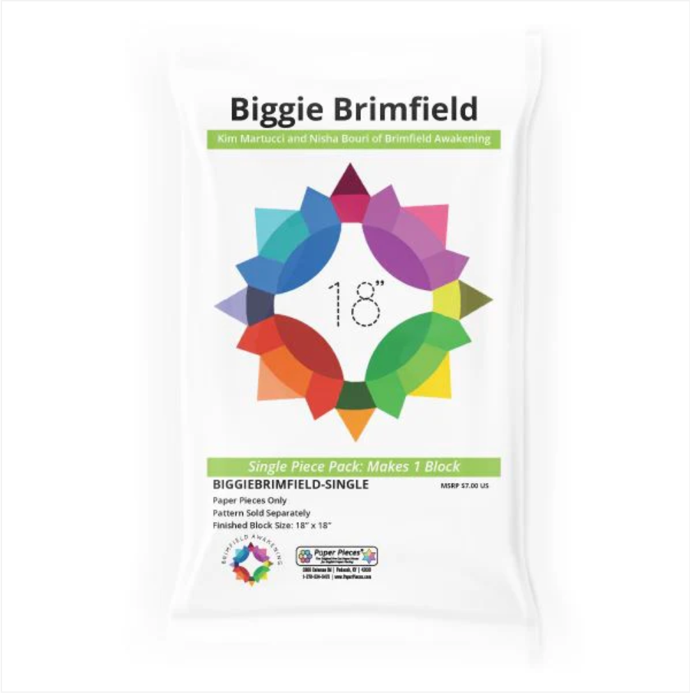 Biggie Brim is the next larger size Brimfield Block from the girls at Brimfield Awakening. The Brimfield Block family of EPP blocks has sizes that span from 3.5″ to 18″. This Biggie Brim next larger Brimfield Block size finishes at 18″. The larger size allows you to showcase larger scale fabric motifs in the center of your block.