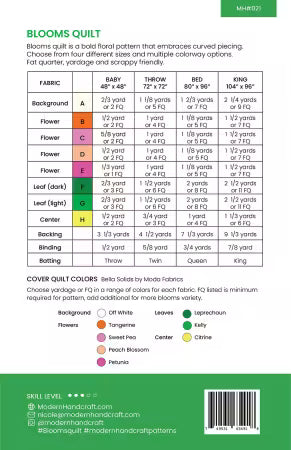 Fresh, bold, and unapologetically fun - the Blooms Quilt turns simple curved blocks into a modern field of oversized flowers. Designed by Nicole Daksiewicz of Modern Handcraft, this pattern is all about clean lines and playful color, with petals and leaves that pop against crisp negative space.