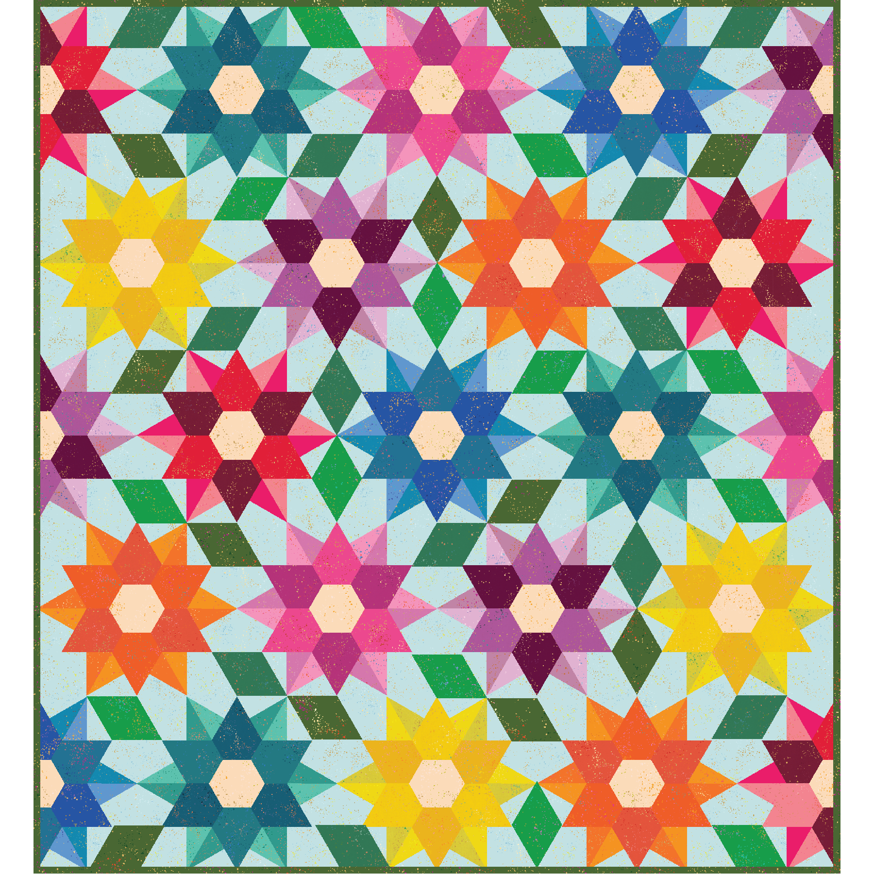 Bold. Radiant. Absolutely joyful. The Dancing Dahlias Quilt Kit brings Krista Moser’s iconic diamond-and-star design to life using the painterly sparkle of Speckled fabrics by Ruby Star Society. Every color in this quilt feels alive - saturated teals, punchy pinks, glowing yellows, electric blues, and fiery oranges - all framed by your choice of a crisp Light Speckled background or a rich Dark Speckled night-sky backdrop.