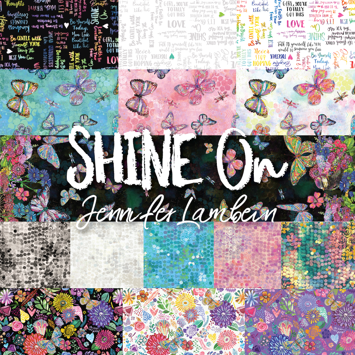 This version features the upcoming Shine On fabric collection by Jennifer Lambein for Windham Fabrics—a radiant mix of florals, textures, and uplifting motifs in vivid purples, sky blues, fuchsias, and citrus. Printed on premium quilting cotton, these fabrics celebrate whimsy and light, with layered designs and a sense of expressive creativity woven into every block.