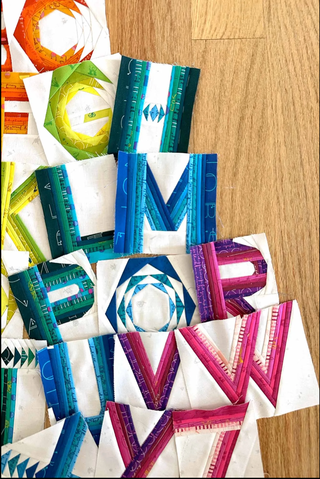 Step-by-step illustrated guidance for piecing and assembling letter blocks