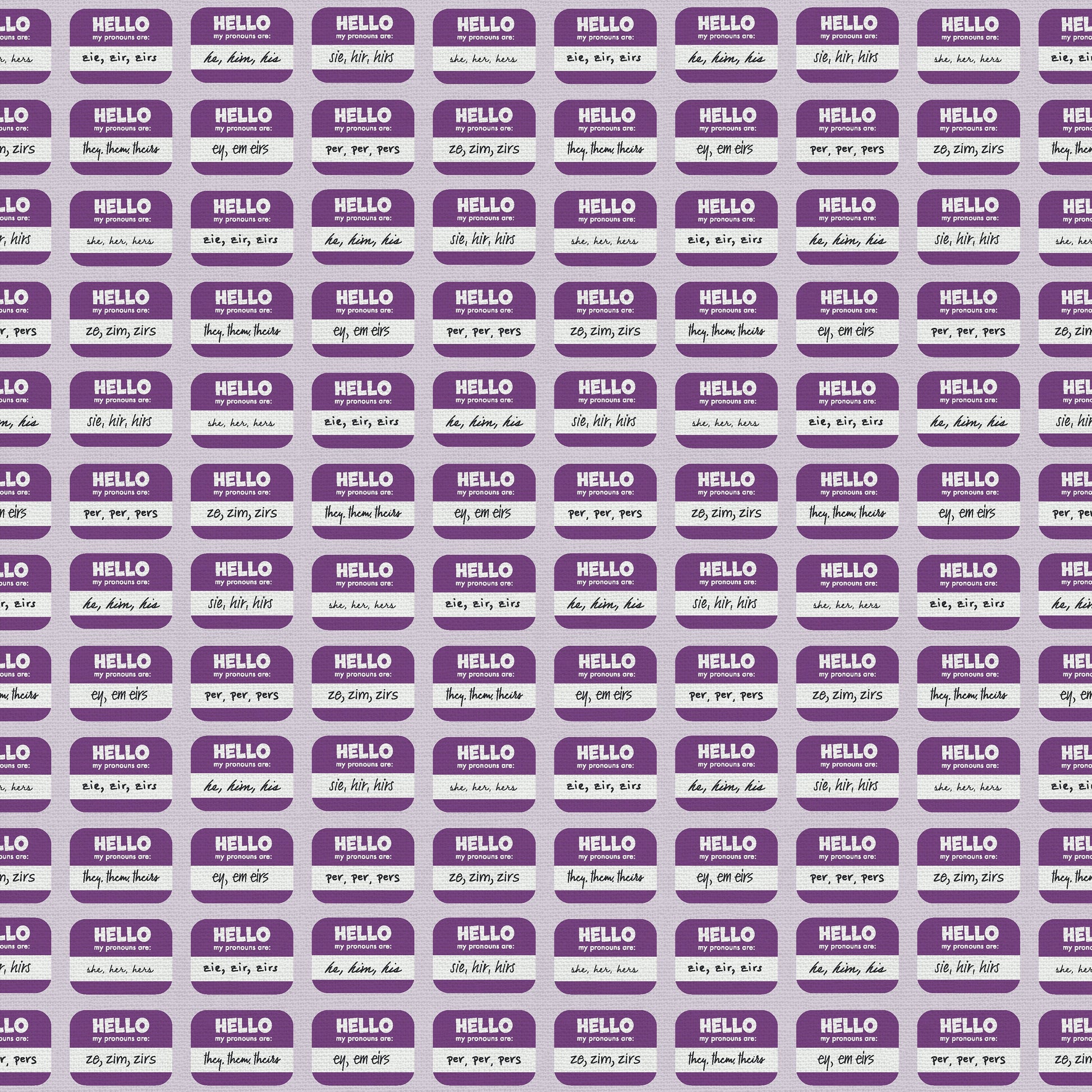 LGBTQIA+ Pride-Stoffe, entworfen von Mathew Boudreaux von Mx Domestic (FKA Mister Domestic. Pronomen-Abzeichen in Lila auf lavendelfarbenem Hintergrund.