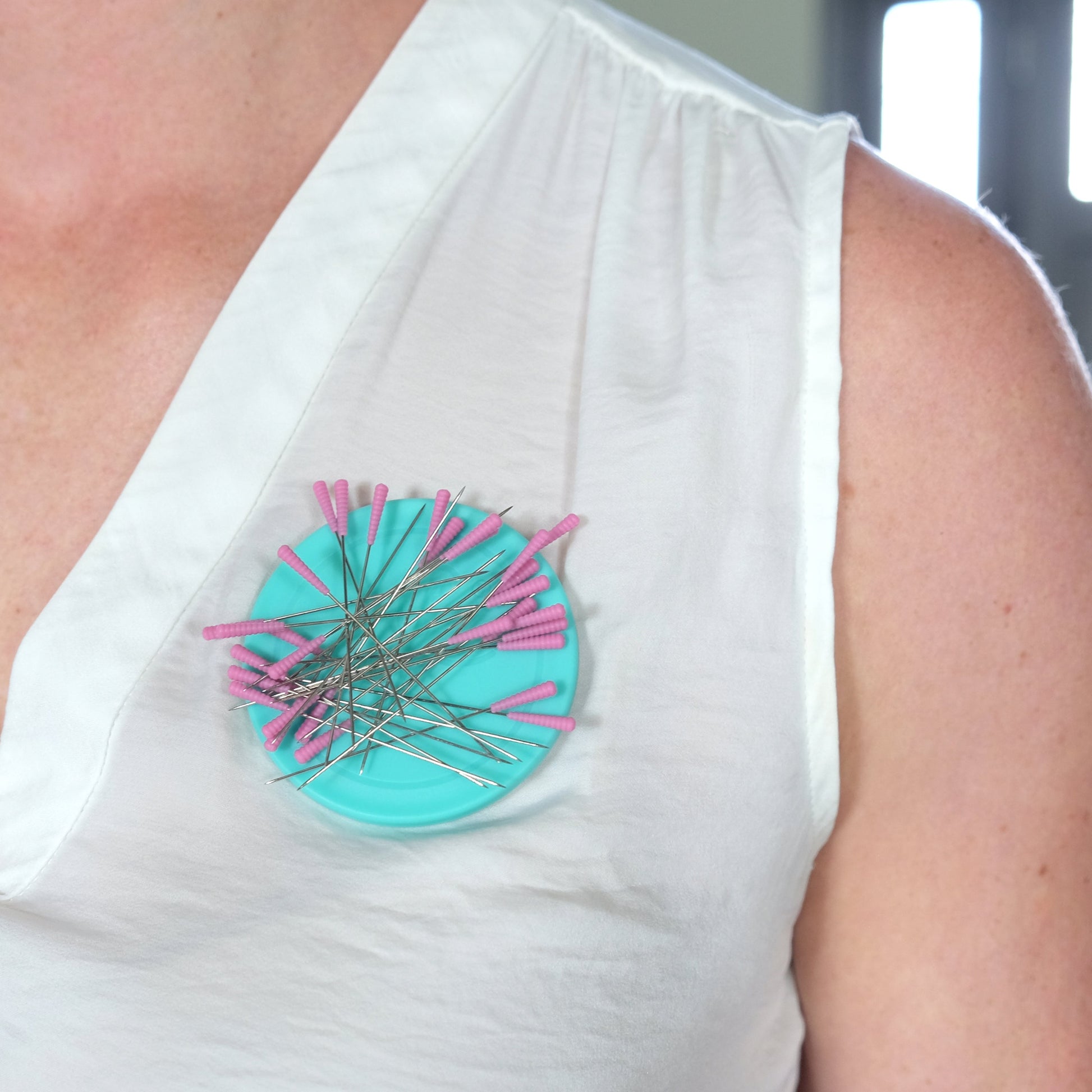 Simply slide it apart, snap it onto your shirt, and stick your pins on it.