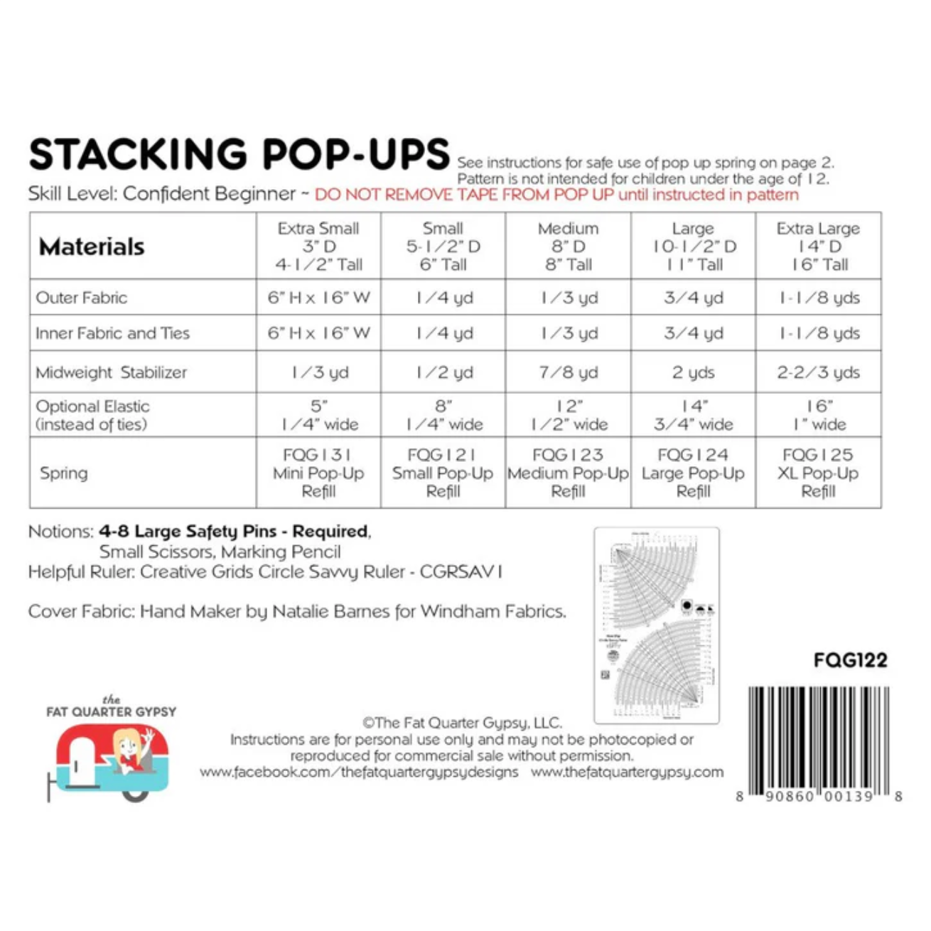 If you liked the FQ Pop-Up then you will love the Stacking Pop-Ups! Three new sizes for all your storage needs. Medium - 8in diameter x 8in tall. Large - 10.5in diameter x1 1in tall. Extra Large - 14in diameter x 16in tall. Pattern does not include Pop-Up Springs. Refills are sold separately.