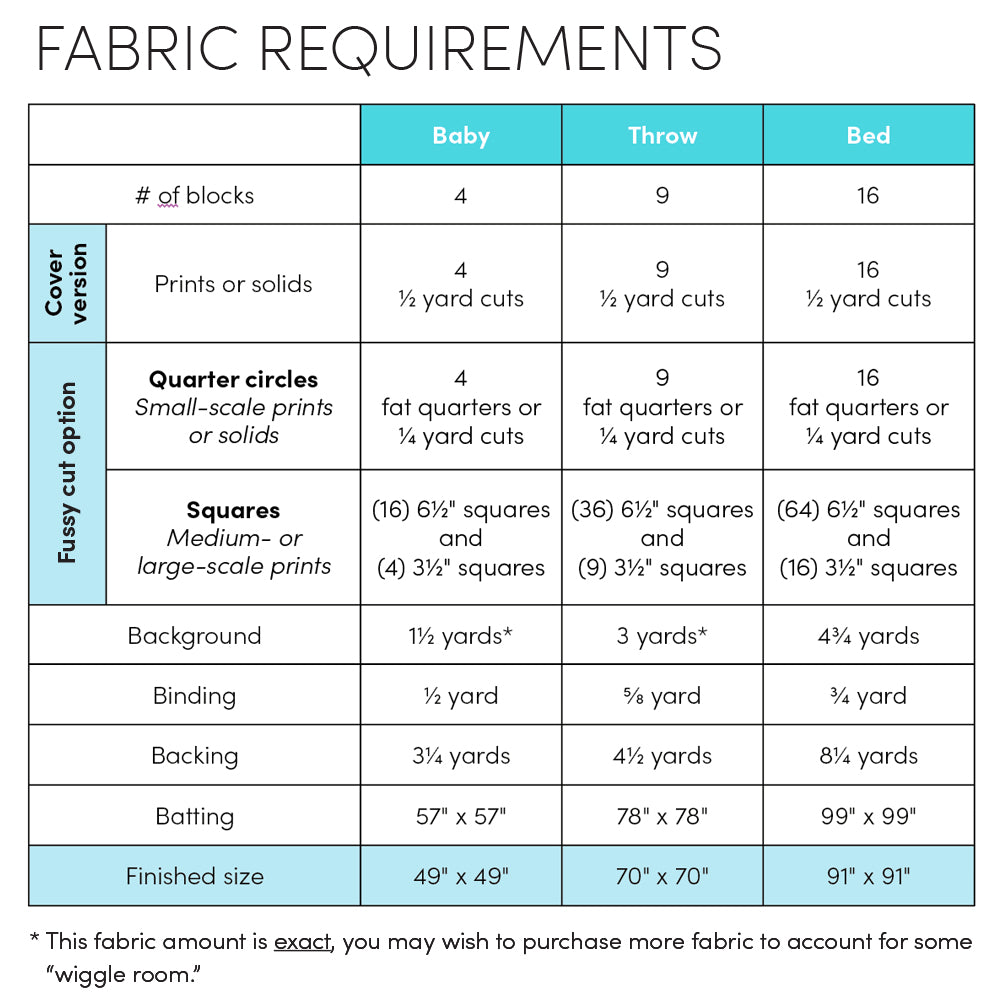 - Comprehensive planning chart outlining quilt sizes and fabric requirements