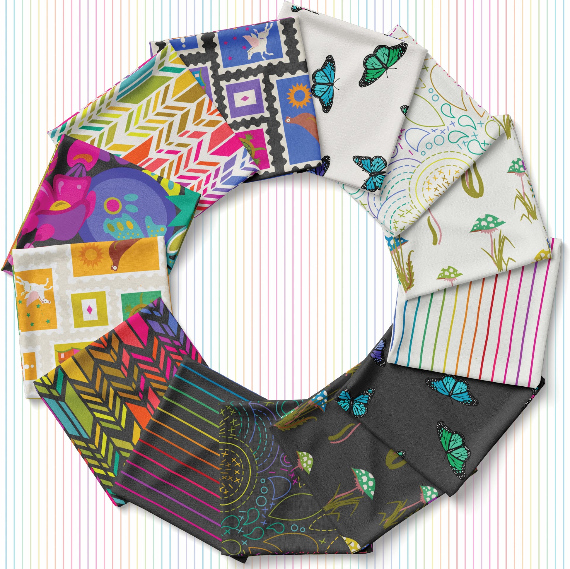 This listing is either a Fat Quarter Bundle (18" x 22") or Half Yard Cut Bundle (18" x 44") of the 16 prints from Color Wheel by Alison Glass with Andover Fabrics.