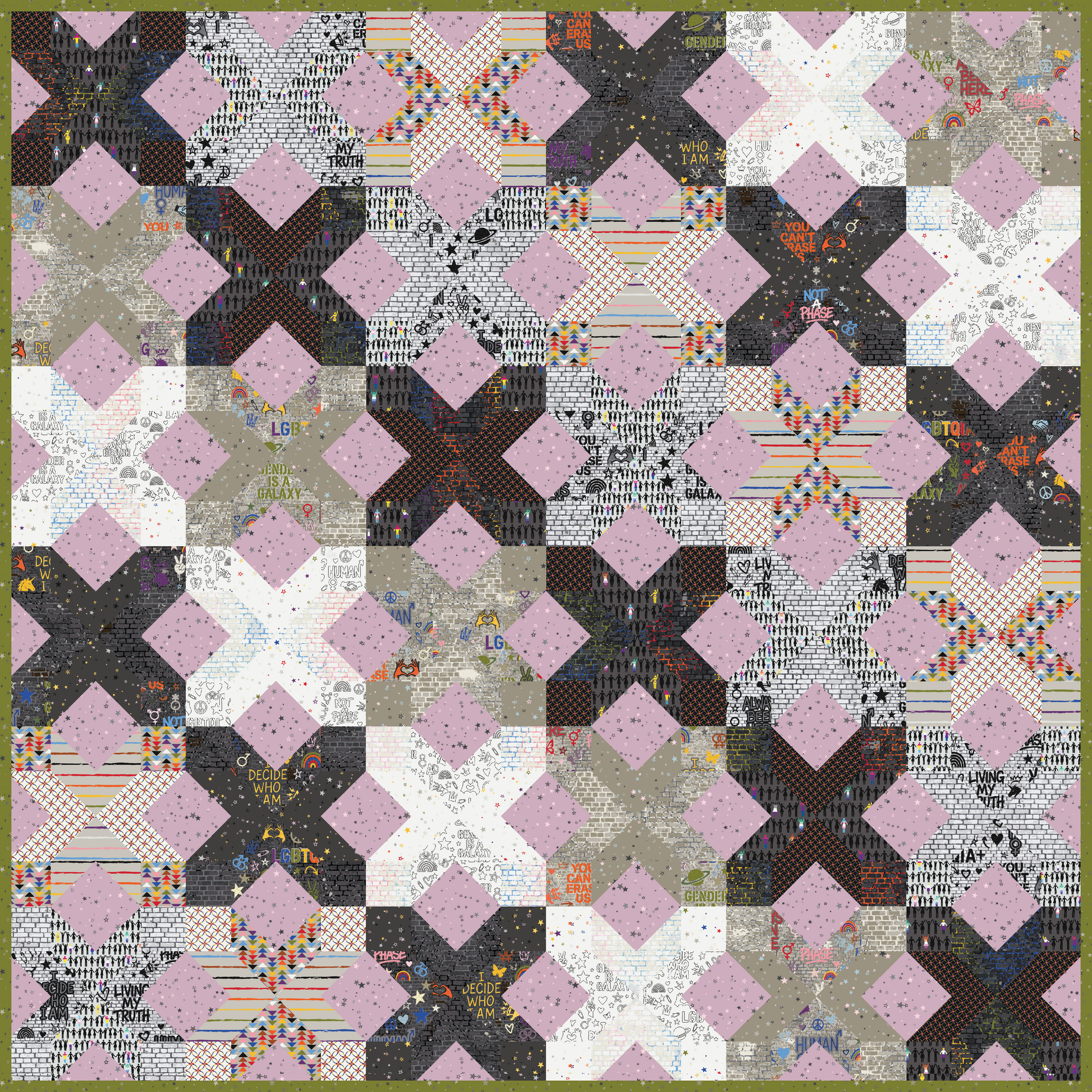 Make a quilt that tells a story. This exclusive kit uses 18 prints from Mx Domestic's Always Been Here fabric collection to bring the Ironwood Point quilt pattern by Holly Clarke Design to life—honoring queer identity, resistance, and joy in every stitch.
