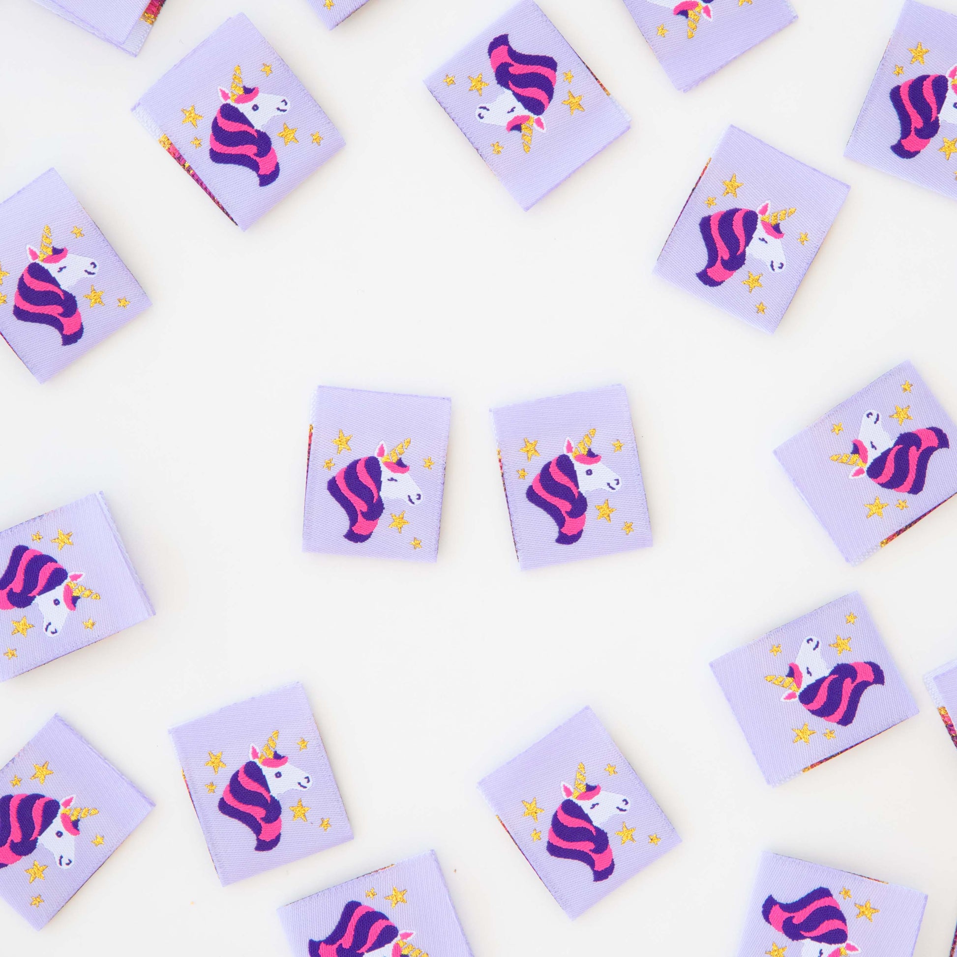 Add a touch of magic and sparkle to your handmade projects with our Unicorn Woven Labels. These double-sided labels feature a whimsical unicorn design in shades of purple and pink, accented with metallic gold for a touch of enchantment. Perfect for adding a unique and playful touch to any project.