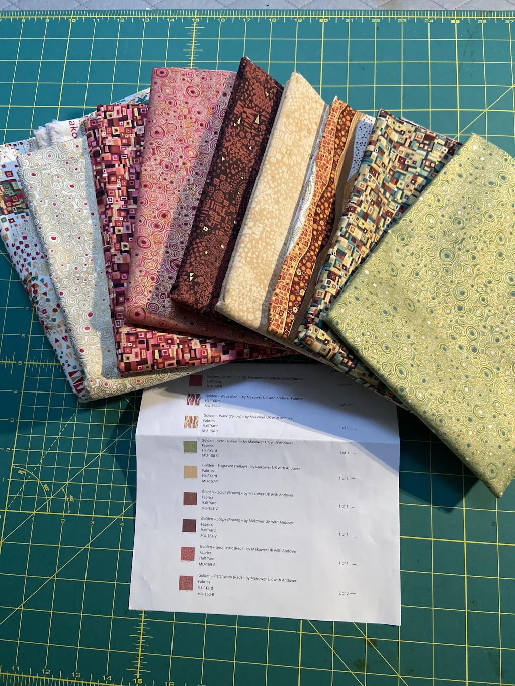 Want a fabric that feels like you’ve draped Klimt’s art across your quilt? That’s what Golden delivers. These prints swirl with ornamental flourishes and warm jewel tones, accented with just enough metallic gold to glow without going over the top.