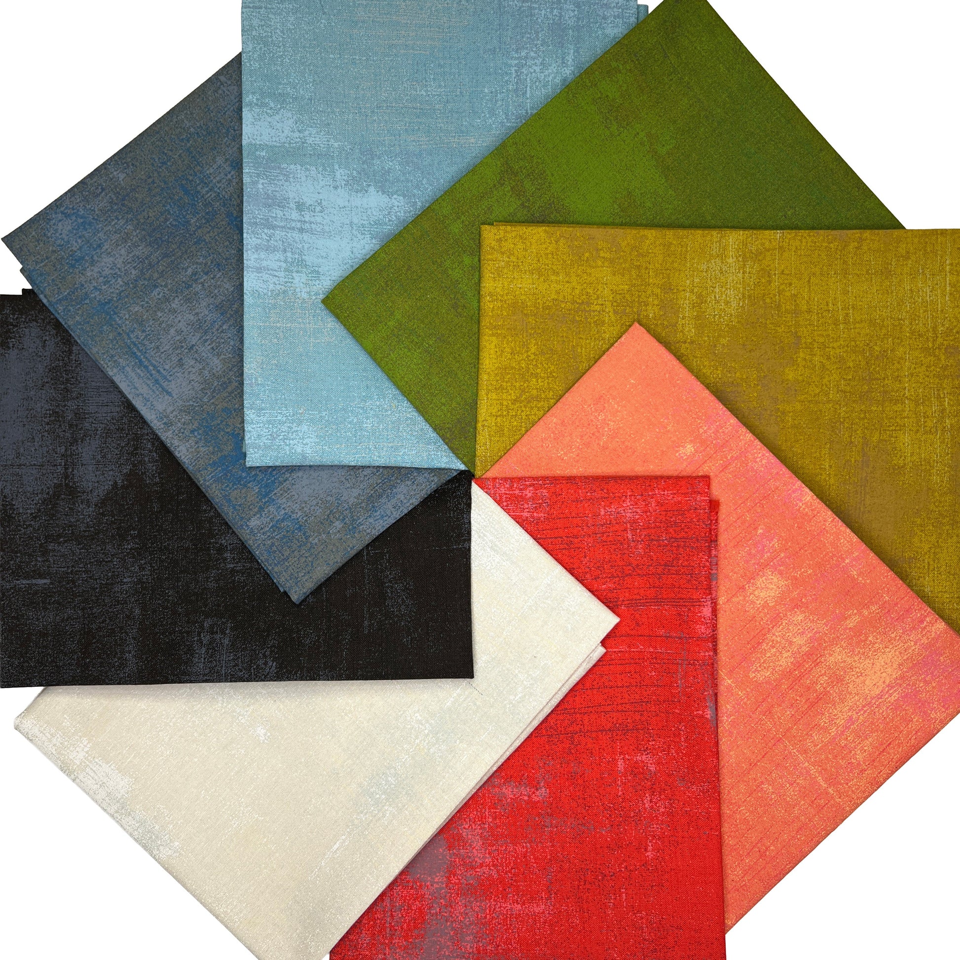 Grunge does what it always does best: reads like a solid from a distance, reveals layers up close. Subtle movement, painterly texture, and colors that feel lived-in rather than loud. These shades lean earthy, moody, and modern — the kind of palette that anchors a quilt without flattening it.