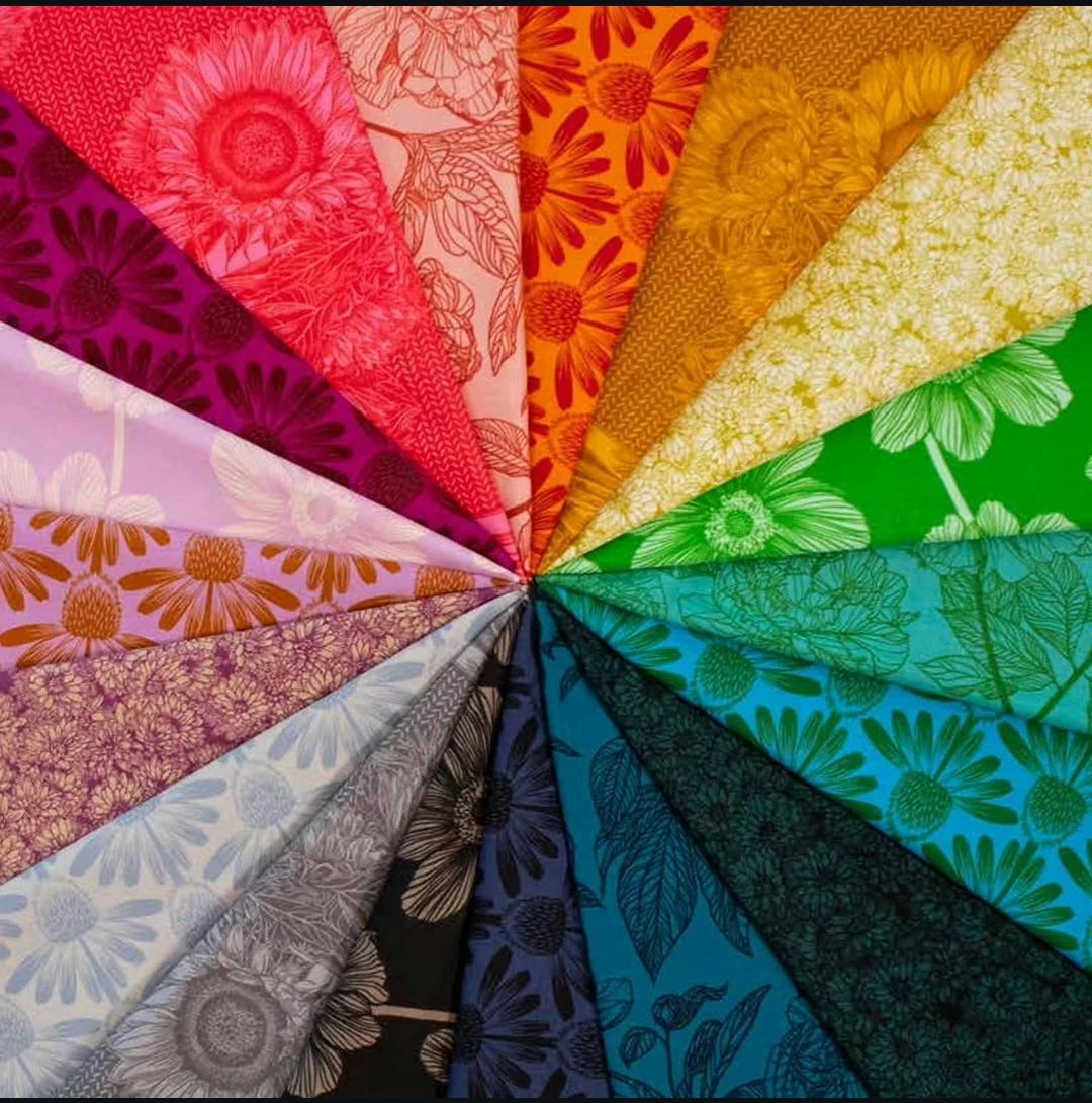- All Indelible fabrics required for the quilt top and binding, featuring beloved designs like Echinacea, Peony, Mums, Sunflowers, and Anemones, flowing through sunlit, soft, bright, and deep tones.