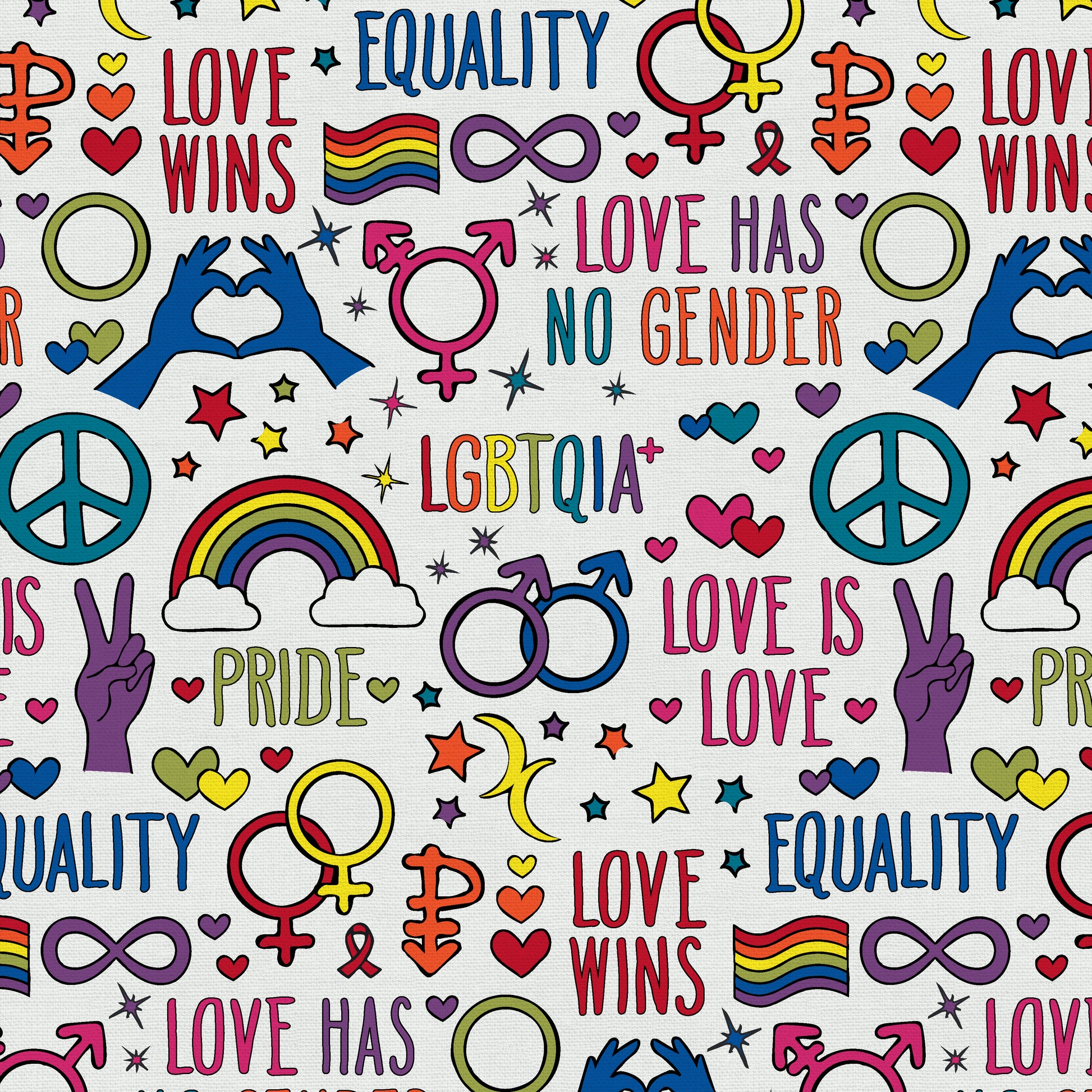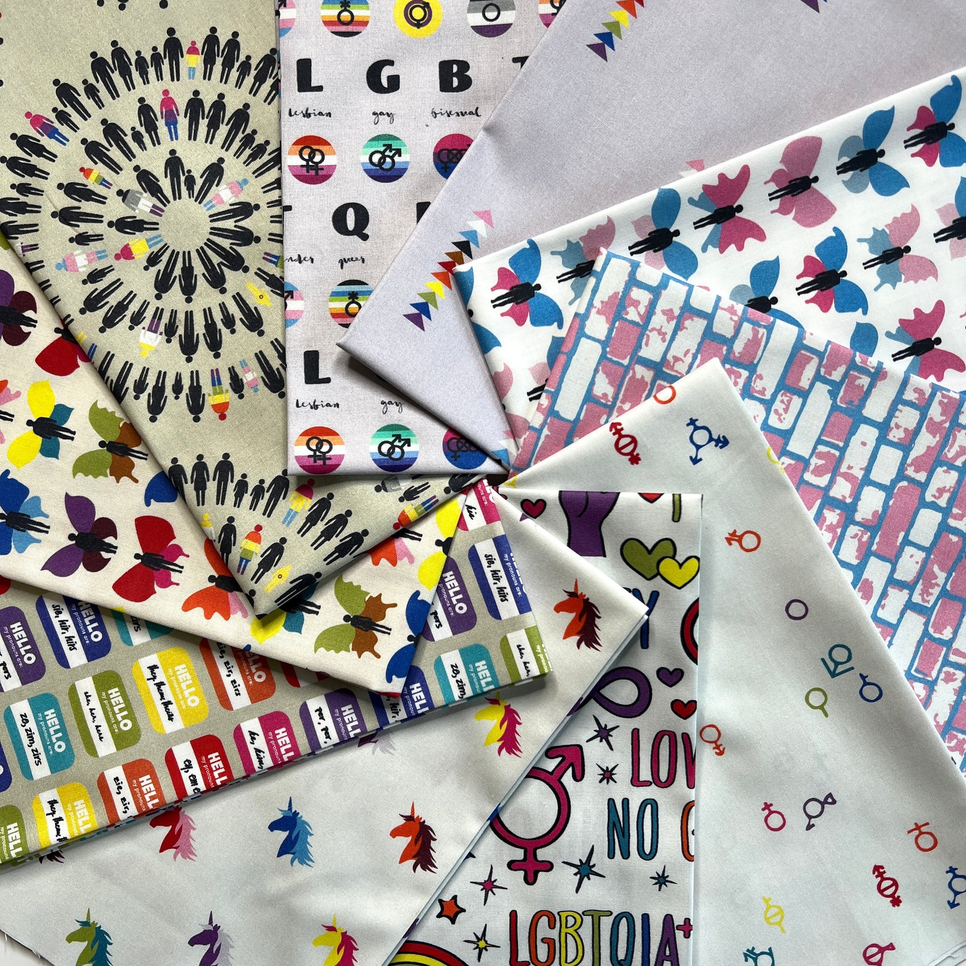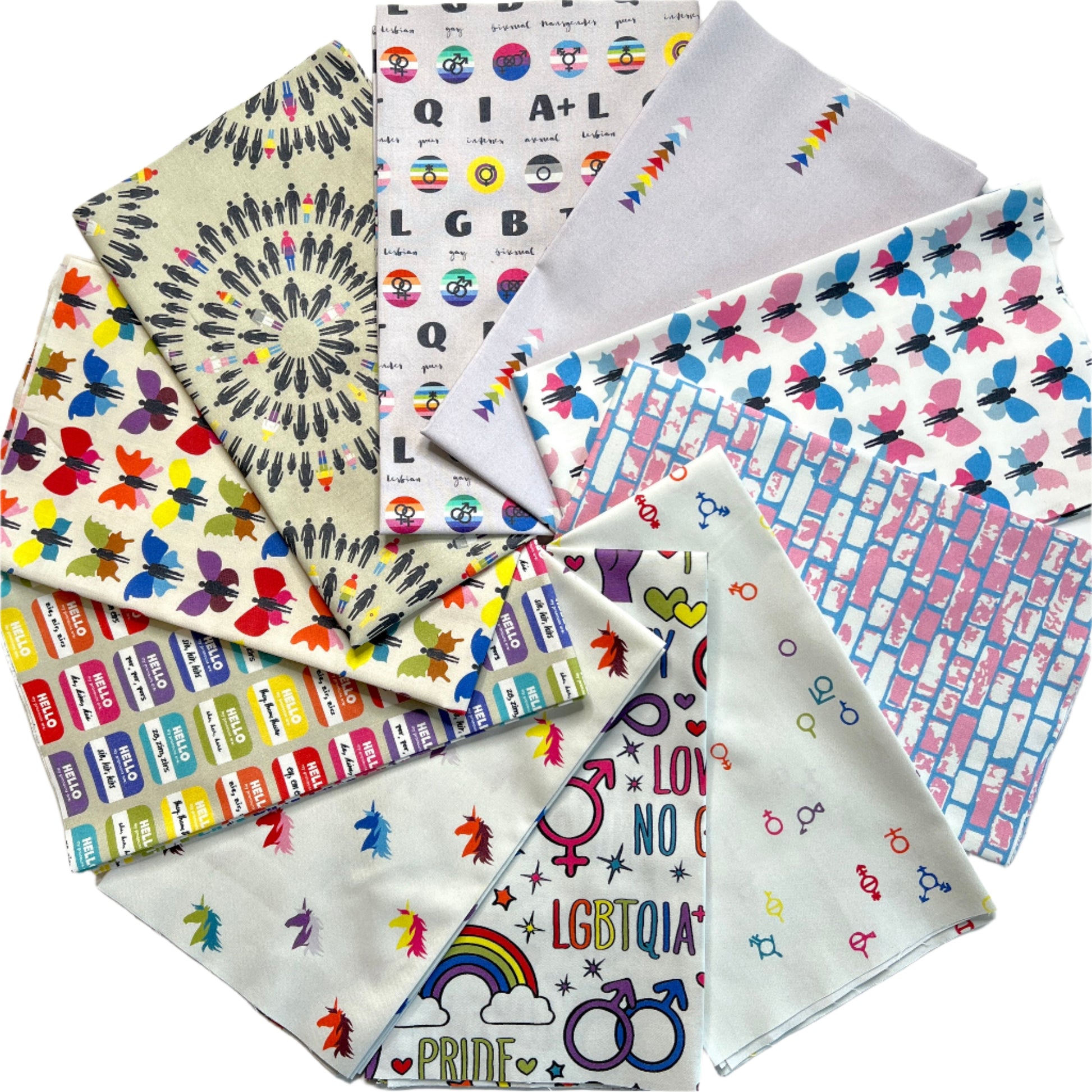 This listing is either a Fat Quarter (18" x 22") or Half Yard Bundles (18" x 44") of 10 prints from Mx Domestic's Love is Love Pride Fabric Collection.