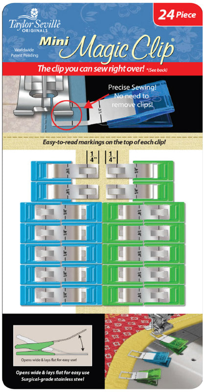 Taylor Seville Originals' Mini Magic Clips™ are 1.5 inch long and are perfect for holding several layers of fabric together for all kinds of sewing and craft projects. Be it hemming, quilting, patchwork, embroidery, apparel, or applique projects, Taylor Seville Mini Magic Clips™ are the perfect solution. These clips are a great alternative to pins as they do not leave a mark on the materials used. Made of quality stainless steel and plastic. Taylor Seville Mini Magic Clips™ have markings at 1/4" on top of the clip which are clearly visible while machine stitching. The clips are flat and can easily go under the presser foot with a 1/8" clearance to the needle tip.