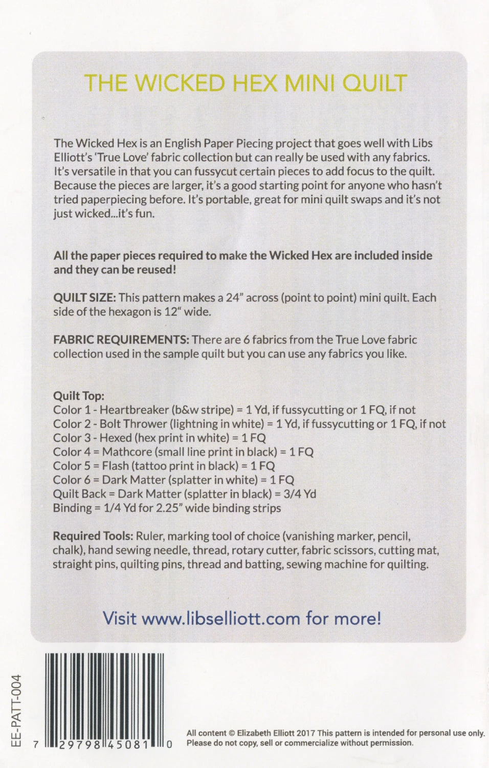 Finished Quilt Size: 24in across (point to point). The Wicked Hex is an English Paper Piecing project. It’s versatile in that you can fussy-cut certain pieces to add focus to the quilt. Because the pieces are larger, it’s a good starting point for anyone who hasn’t tried English Paper Piecing before. It’s portable, great for mini quilt swaps and it’s not just wicked...it’s fun.